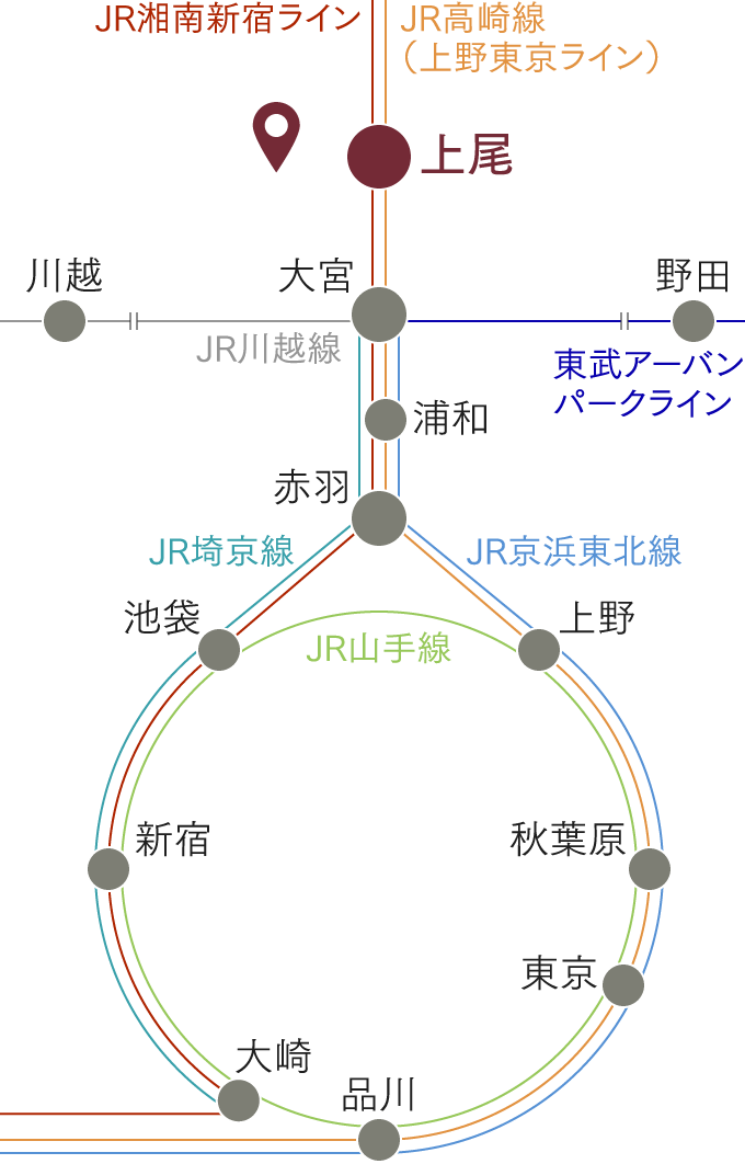 JR高崎線「上尾」駅から大宮駅まで約10分、