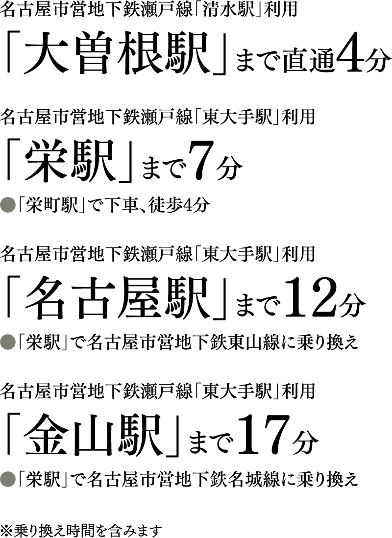 上記の所要時間は、平日の通勤時(8:00〜)のもので、時間帯により異なります。また、乗り換え時間を含みます。