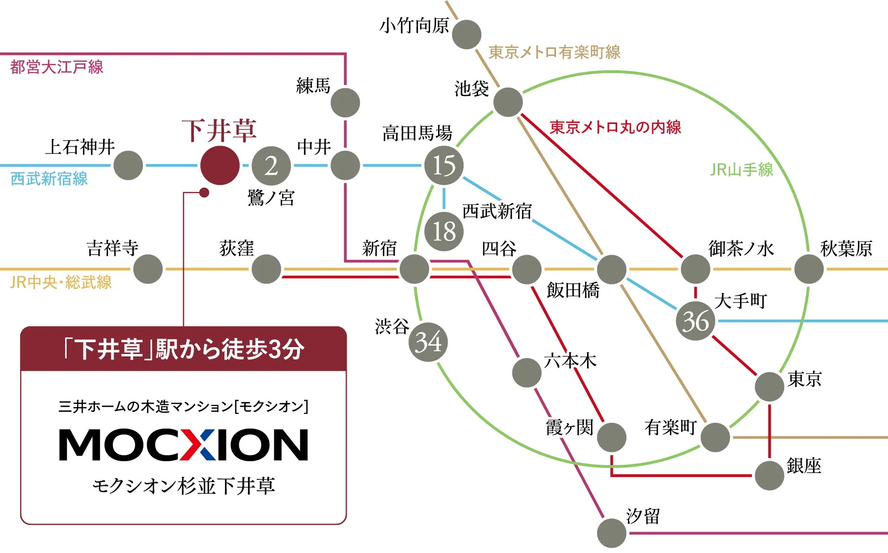 西武新宿線下井草駅から高田馬場駅まで電車で15分、新宿駅まで電車で27分。